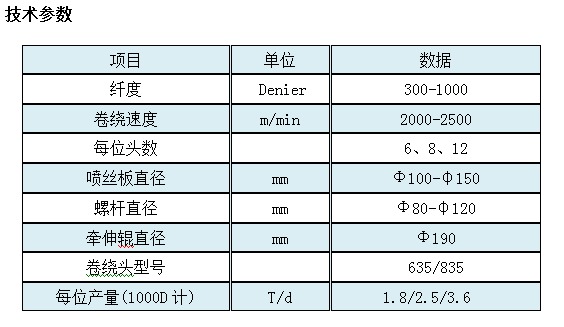 丙綸高強FDY紡牽聯(lián)合機主要特點 1.螺桿為加長型,變頻及壓力調(diào)節(jié)儀器為進(jìn)口品牌。 2.采用了新型高效節(jié)能型紡絲箱體,比普通紡絲箱節(jié)能。 3.采用上裝式組件,方便紡絲工操作。 4.側(cè)吹風(fēng)系統(tǒng),風(fēng)速均勻穩(wěn)定,纖維條干好。 5.采用感應(yīng)或高頻加熱牽伸輥輥,降低能耗。 6.多種組合的多級牽伸和熱定型方式可滿足丙綸牽絲不同性能的要求,紡絲強度大于7g/d。 7.采用全自動卷繞頭,切換成功率高、廢絲率低、成形良好。 8.溫控儀表、變頻器為進(jìn)口品牌。