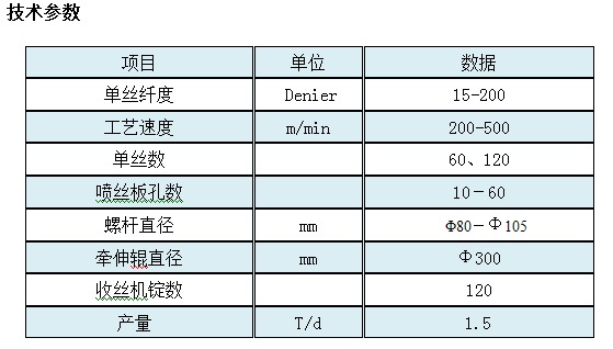 設備用于滌綸、丙綸、錦綸粗旦纖維工業(yè)絲的生產,該絲主要用于漁網線、繩索、高密度濾布、頭巾、緍紗、面罩、墊肩、遮陽布等。